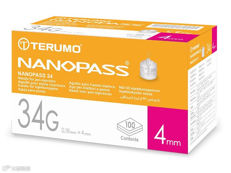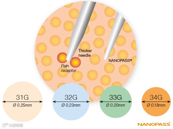 每平方厘米的人类皮肤表面有100-200种疼痛感受器。Nanopass 34G降低了接触疼痛受体的可能性,因此使胰岛素注射的疼痛减轻。NANOPASS Jr比泰尔茂之前推出的Nanopass 32G薄22%,对皮肤的伤害较小,从而减轻了疼痛。