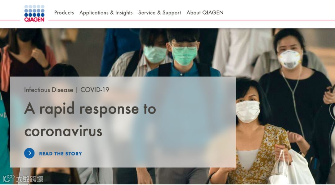 自新冠病毒爆发以来,QIAGEN NV一直在为全球防疫工作提供诊断工具和耗材,包括QIAGEN提取试剂盒、试剂和用于实时聚合酶链反应(RT-PCR)工作流程的仪器。同时还正在部署QIAsymphony模块化仪器和NeuMoDx集成PCR系统,以及面对自动化实验室开发的SARS-CoV-2测试。2020年2月26日,QIAGEN NV宣布已将其最新开发的QIAstat-Dx呼吸道检测仪2019-nCoV测试套件运送至中国。新试剂盒可检测新型冠状病毒SARS-CoV-2,并在公共卫生紧急情况下提供快速样品检测,同时QIAstat-Dx测试系统也被运送到欧洲、东南亚和中东等地的医疗机构。