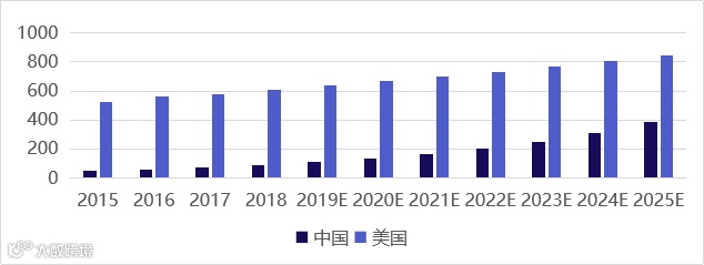 由于运动医学主要是通过关节镜进行微创治疗运动损伤,关节镜系统的保有量和关节镜手术量是决定整个相关器械市场的重要影响因素。近年来,各个医院关节镜系统保有量迅速增长,预计2019年将超过8000台,CAGR达到20%。据统计2017年,关节镜外科从业人员突破3000人,关节镜手术量达70万台,其中仅在膝关节前交叉韧带重建治疗方面,年手术量达10万例。虽然相较于美国市场还有较大差距,但在手术量增长速度上,美国仅有4.8%,而中国达到CAGR24.1%。