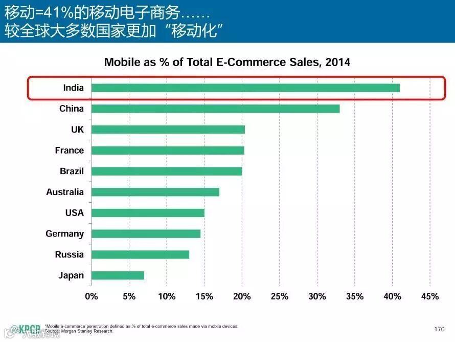 新兴的大型互联网市场(印度、印尼、尼日利亚和墨西哥)=2014年网民增长24%,而2013年为23%=发展依旧迅速