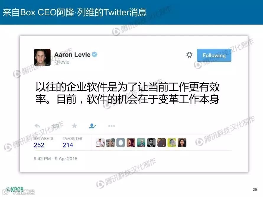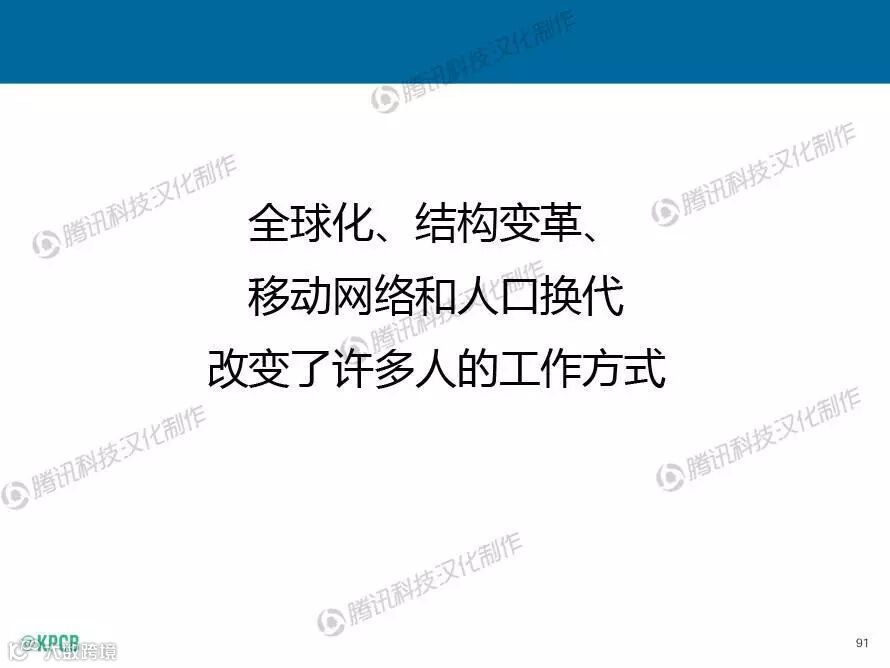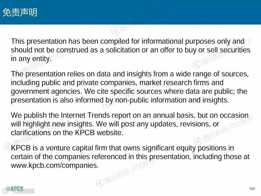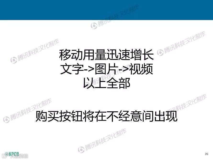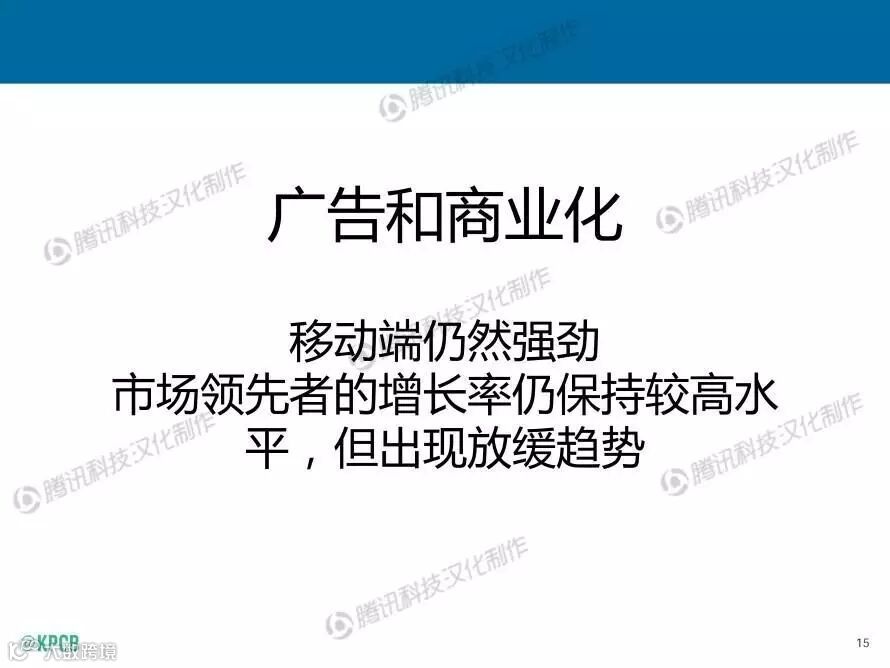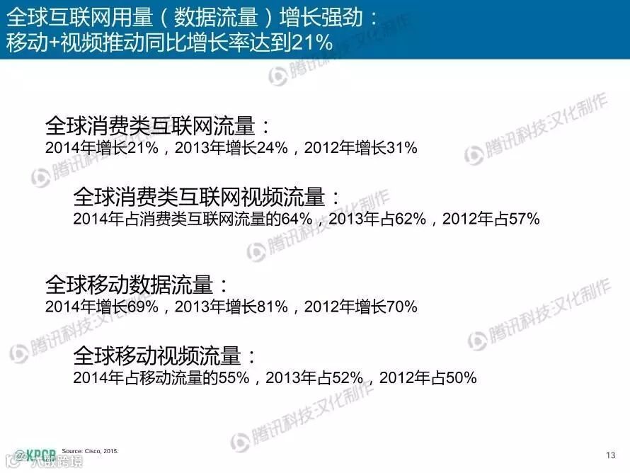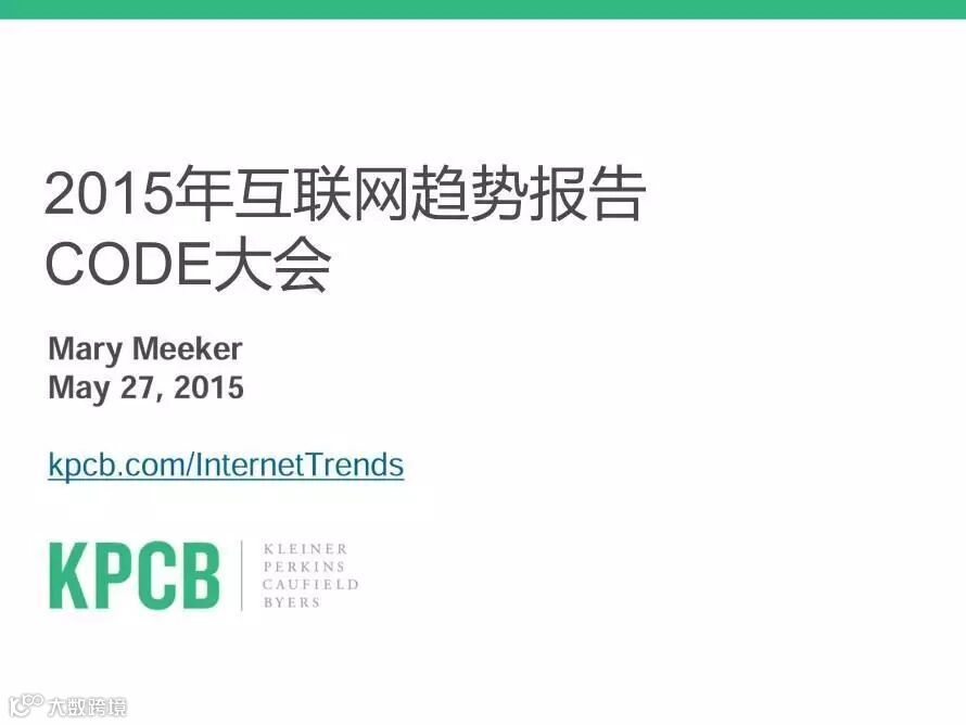 每年此时,凯鹏华盈(KPCB)合伙人、享有“互联网女皇”美誉的玛丽·米克尔(Mary Meeker)都会公布一份互联网趋势报告,这份报告中包含了她对互联网发展趋势的完整剖析,覆盖从移动设备使用到互联网使用等各个方面的内容。腾讯科技对该报告进行汉化,以方便广大网友阅读。