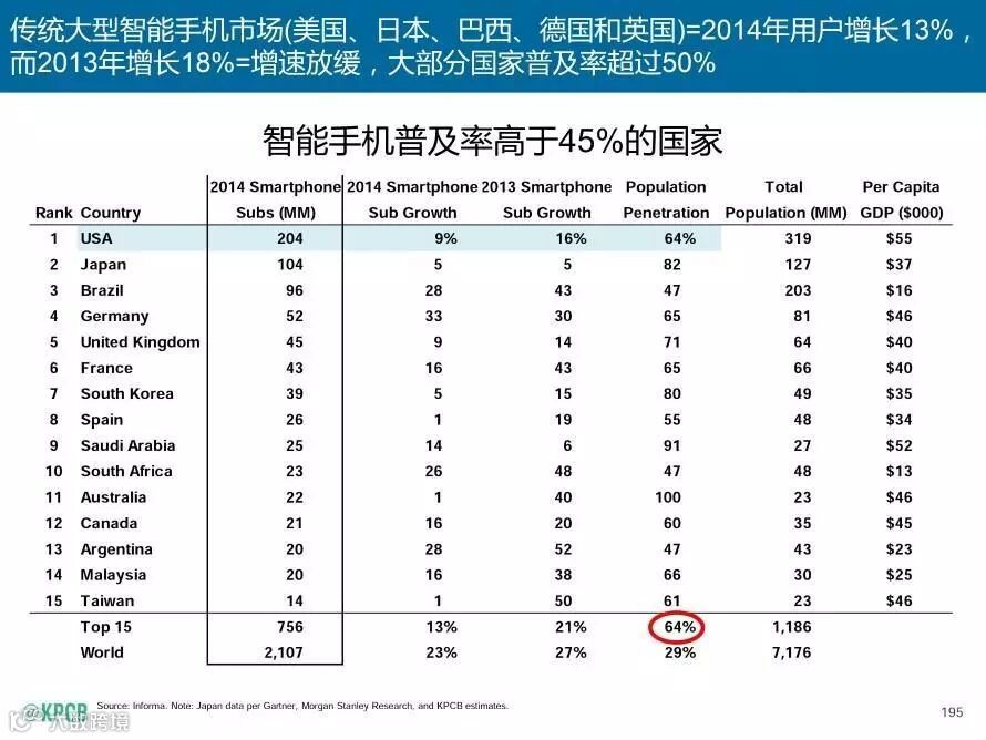 传统大型智能手机市场(美国、日本、巴西、德国和英国)2014年用户增长13%,而2013年增长18%,增速放缓,大部分国家普及率超过50%