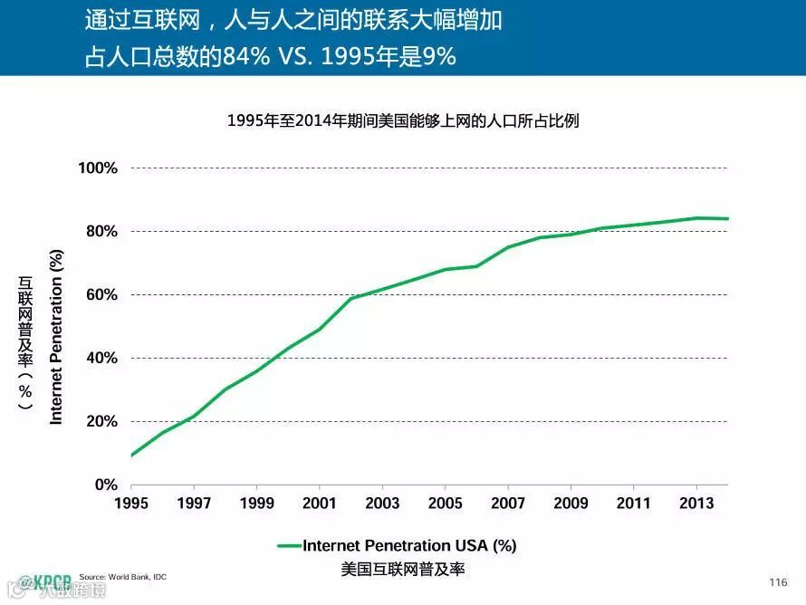 通过互联网,人与人之间的联系大幅增加,互联网普及率已达到84%,1995年是9%。