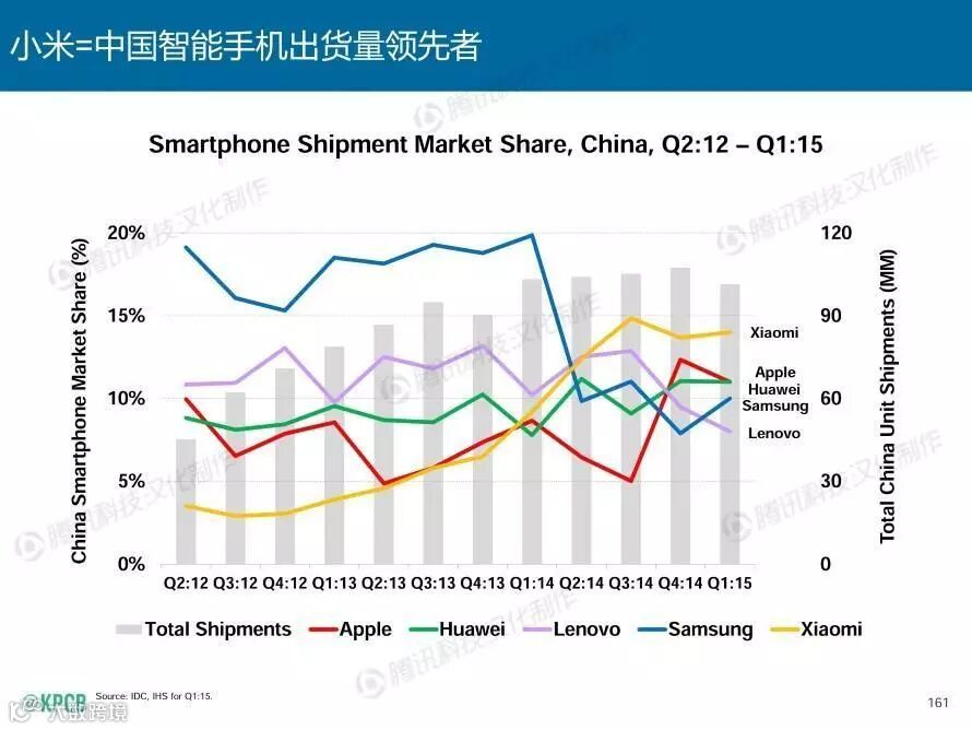小米智能手机出货量迅猛增长,2014年全球出货量达到了6100万部,同比增长227%