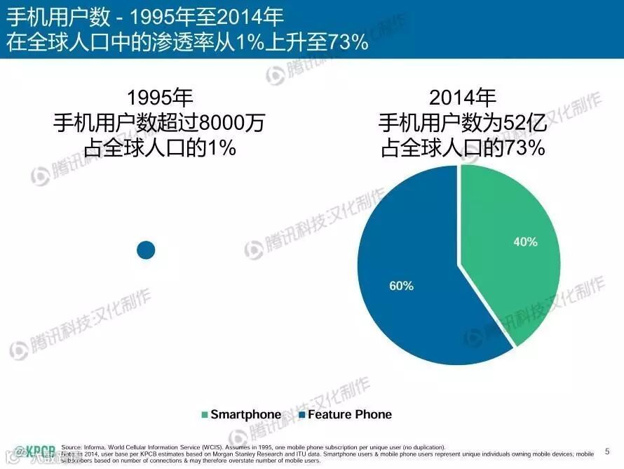 手机用户数从1995年的8000万发展至2014年的52亿,在全球人口中的渗透率从1%上升至73%