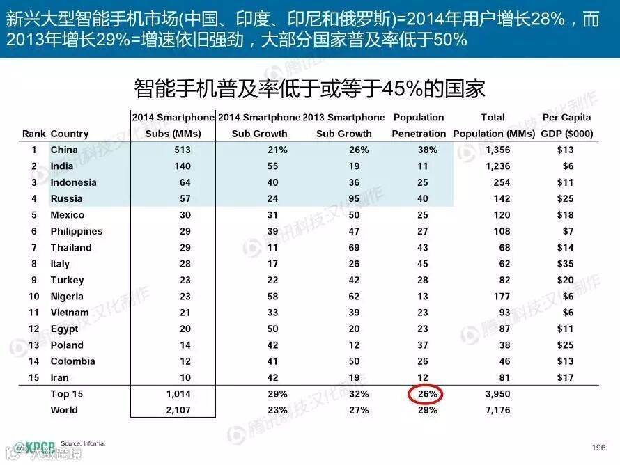 新兴大型智能手机市场(中国、印度、印尼和俄罗斯)2014年用户增长28%,而2013年增长29%,增速依旧强劲,大部分国家普及率低于50%