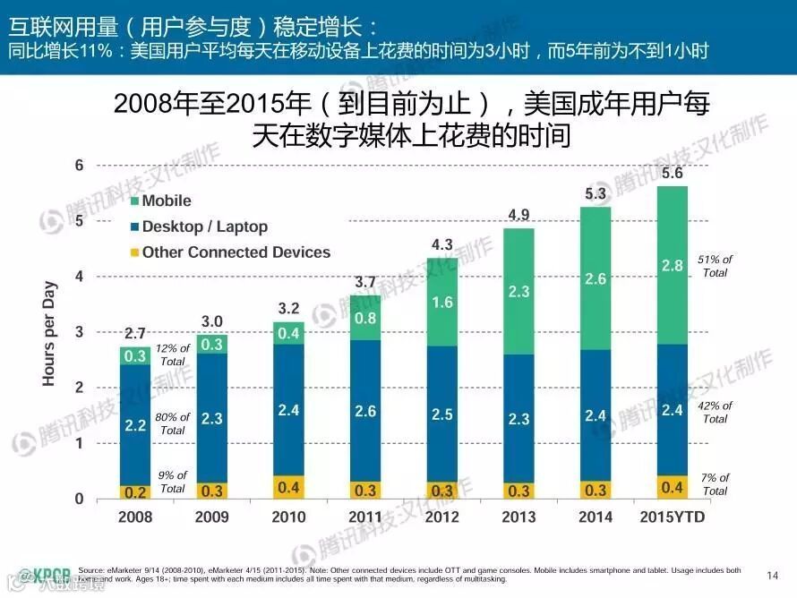 美国用户平均每天在移动设备上花费的时间为3小时,而5年前为不到1小时。