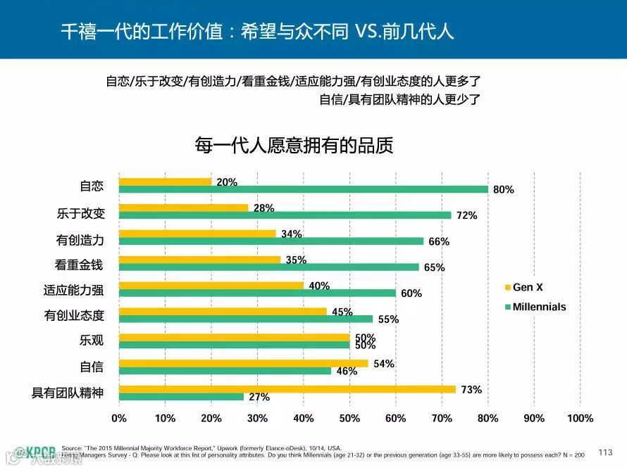 千禧一代的工作价值,希望与众不同,自恋/乐于改变/有创造力/看重金钱/适应能力强/有创业态度的人更多了,自信/具有团队精神的人更少了