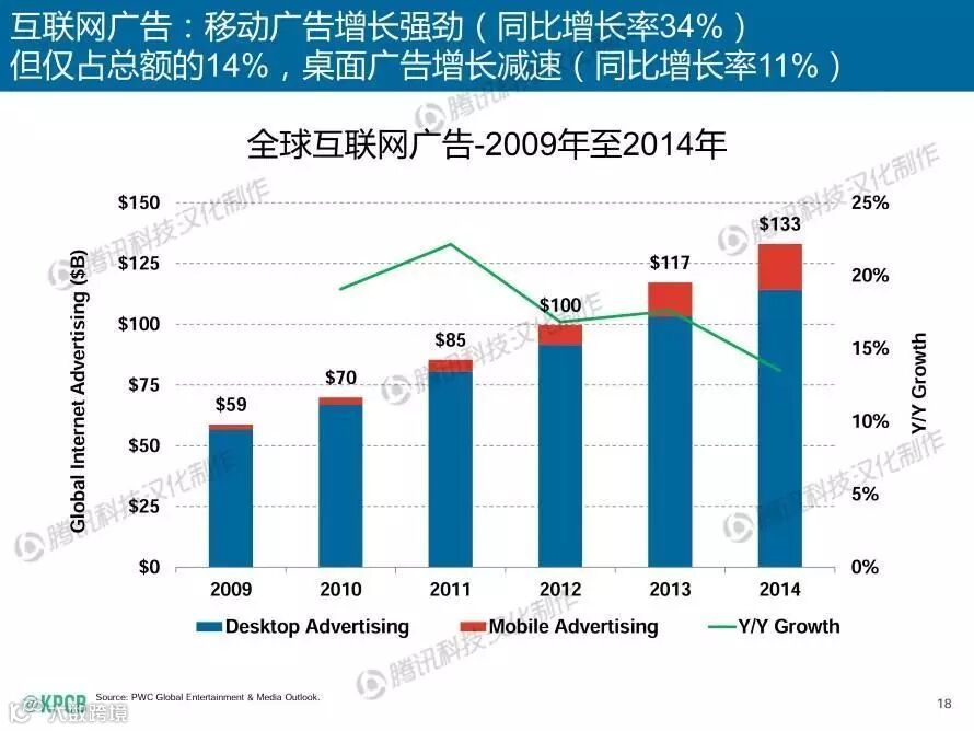 互联网广告:移动广告增长强劲(同比增长率34%),但仅占总额的14%,桌面广告增长减速(同比增长率11%)。
