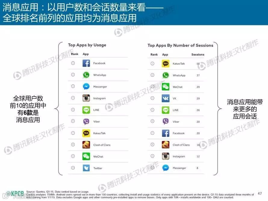 全球用户数前10的应用中,有6款是消息应用,消息应用能带来更多的应用会话