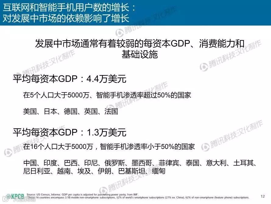 对发展中市场的依赖影响了互联网和智能手机用户数的增长,发展中市场通常有着较弱的每资本GDP、消费能力和基础设施。