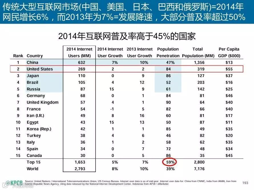 传统大型互联网市场(中国、美国、日本、巴西和俄罗斯)=2014年网民增长6%,而2013年为7%=发展降速,大部分普及率超过50%