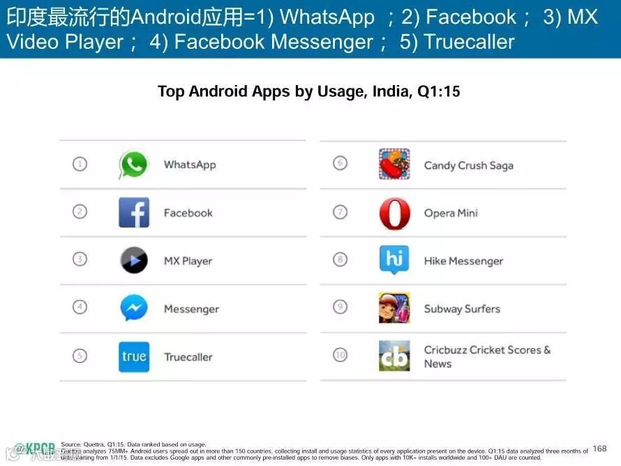 印度最流行的Android应用=1) WhatsApp ;2) Facebook; 3) MX Video Player; 4) Facebook Messenger; 5) Truecaller