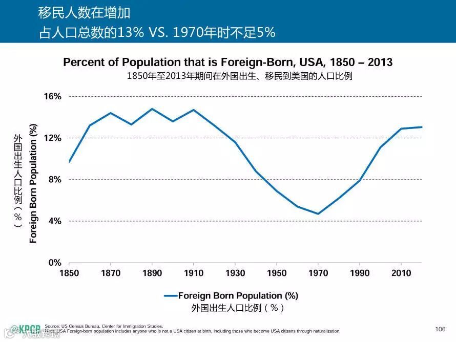 移民人数在增加,1970年时不足5%,现在则有13%。