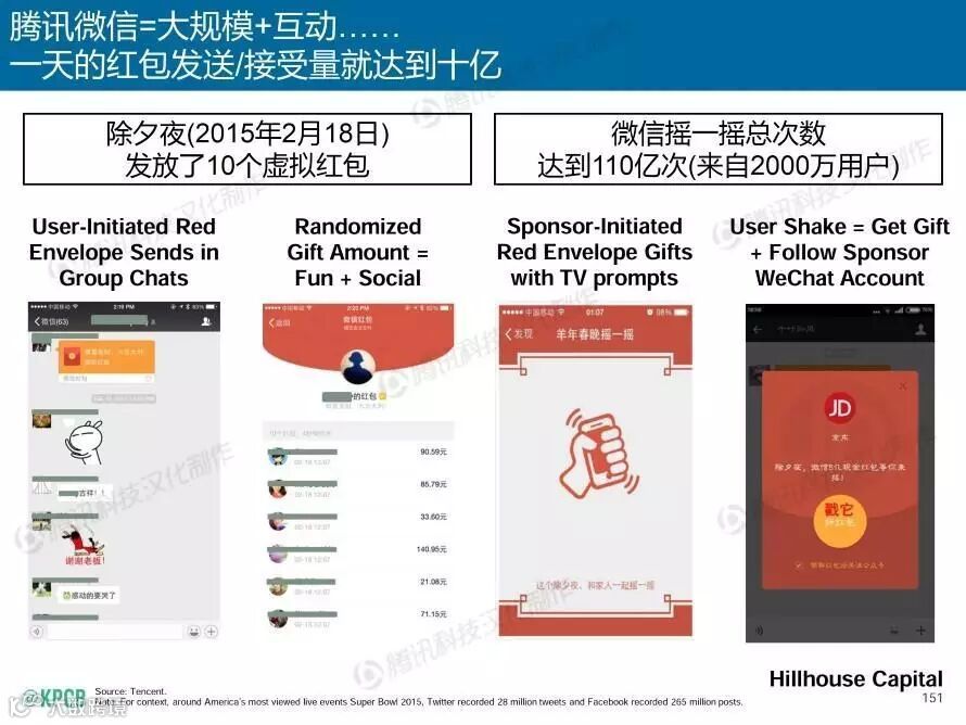 腾讯微信一天的红包发送/接收量就达到十亿,除夕夜(2015年2月18日)发放了10个虚拟红包,微信摇一摇总次数达到110亿次(来自2000万用户)
