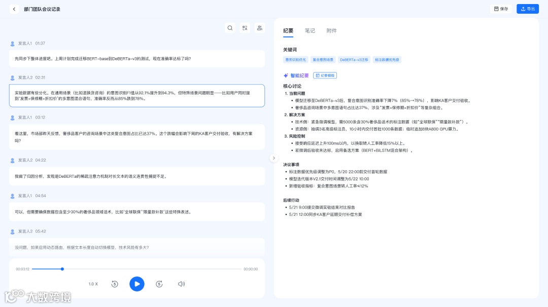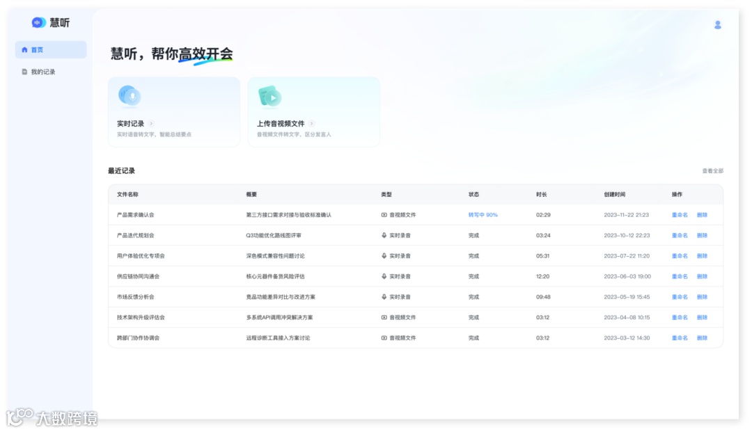 职场中,会议是高频场景,常用于快速同步各部门和项目的执行信息。有了慧听智能会议系统,会后整理工作就更加轻松,再也不用反复拖动录音进度条听音辨人,还能一键生成会议记录!