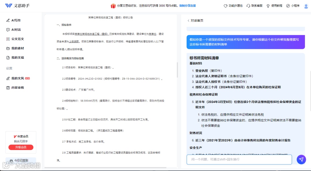 让文思助手阅读招标文件,仔细审阅文件内容,并整理出一份详尽的准备材料清单。