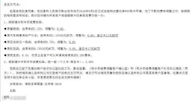 各支行网点:经国务院批复同意,发改委和人民银行联合发布将于2016年9月6日正式实施和改善收单pos刷卡环境,为了不影响费率调整工作,按银联的相关要求和规定,我行现对辖内所有商户受理银联卡收单服务费作统一价: