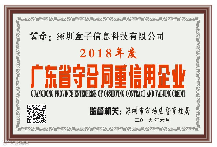 2019年6月26日,深圳盒子信息科技有限公司收到深圳市市场监督管理局颁发的广东省“守合同重信用企业”证书和奖牌。这是政府部门对盒子科技经营理念的肯定,更是对盒子科技继续砥砺前行的一种鼓励和期盼。
