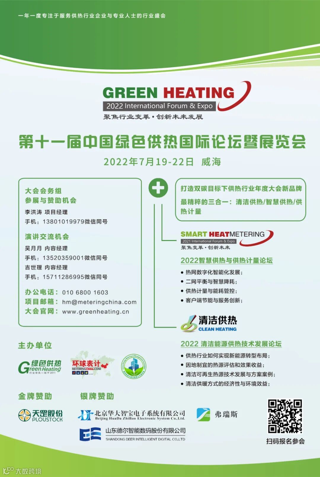“聚焦行业变革·创新未来发展”,《绿色供热》(原《供热计量》)及《环球表计》拟于 2022年7月19-22 日在山东威海联合举办“第十一届中国绿色供热国际论坛暨展览会”,通过国内外 50+行业专家的主题演讲和现场研讨,深度剖析供热企业在“双碳”目标下“清洁低碳化、数智化”技术发展、绿色低碳转型、 创新应用、最新政策等热点话题,分享国内外供热清洁化、供热智能化与先进计量技术经验、创新运营管理模式,为供热企业转型升级和未来发展献计献策。欢迎行业专业人士及企业参会交流。