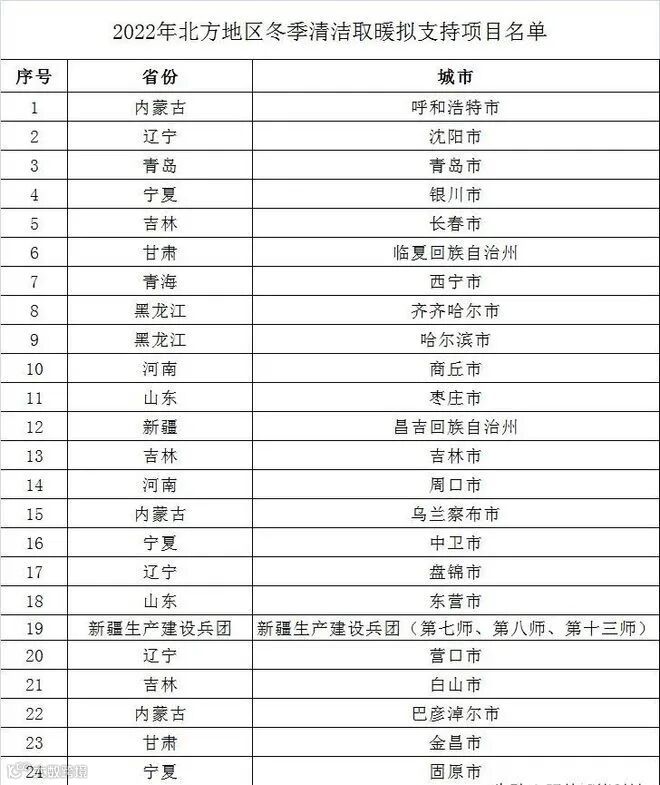 财政部自然资源和生态环境司、住房城乡建设部标准定额司、生态环境部大气环境司、国家能源局综合司联合下发《2022年北方地区冬季清洁取暖拟支持项目名单公示》,25个地区拟入围2022年北方地区冬季清洁取暖拟支持项目名单。