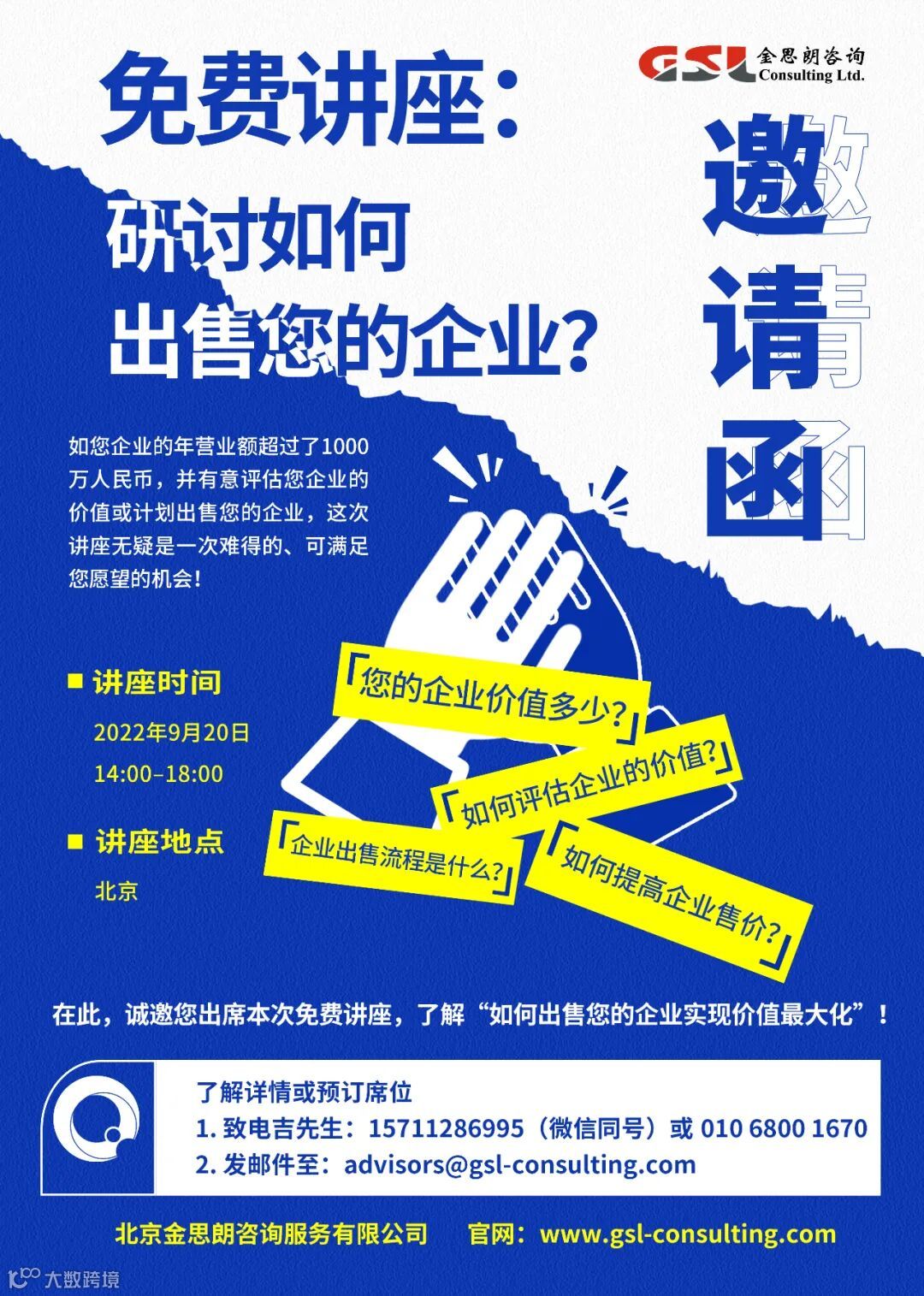如您企业的年营业额超过了1000万人民币,并有意评估您企业的价值或有计划出售您的企业,这次讲座无疑是一次难得的、可满足您愿望的机会!