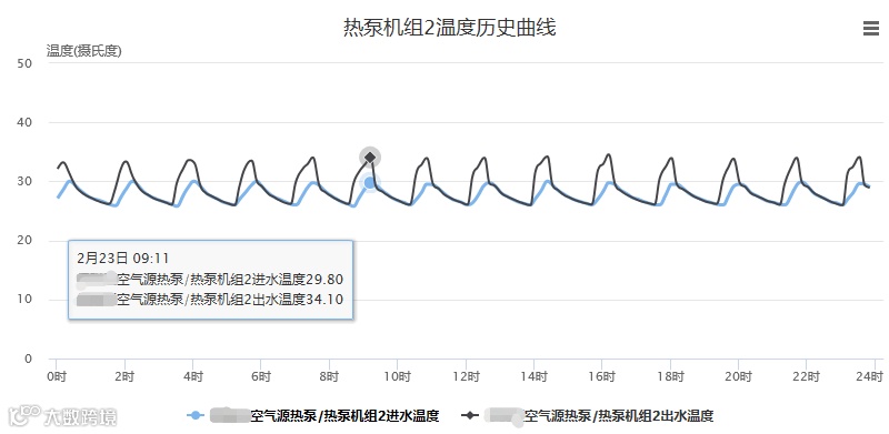 供热初期室外温度较低,设定系统回水温度38℃,在四台热泵机组近满负荷不间断运行和循环水泵工频运行的工况下,空气源热泵机组平均制热性能系数COP在1.8~2.2之间。