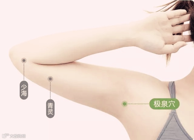极泉穴不仅具有宽胸理气的作用,还可以快速回阳,引血上行,使头脑快速清醒。这个特殊的治疗手法就是弹拨和拍打。遇到生气后心胸气短时,就可以用四指在腋窝正中轻轻地弹拨。我们在弹拨的时候,能明显地感觉到有一条经筋,这条筋的正中就是极泉穴。极泉穴可以治疗人生气发怒后气滞血淤、运行不畅引起的胸闷、气短、心悸、心悲欲哭、手臂胀麻等症状,此时弹拨极泉穴可以增加气血的流通,使人快速平静下来。日常保健时,我们用不着在极泉穴那儿费那么大力气去弹拨,只需要轻轻地拍打即可。平时弹拨拍打两腋下,还可以预防和缓解冠心病、心绞痛等心脏疾病,这相当于我们随身携带的速效救心丸。
