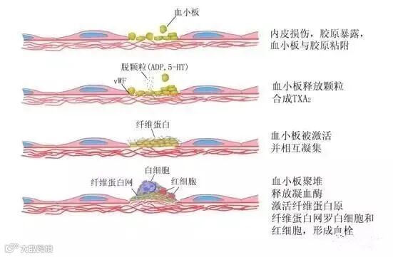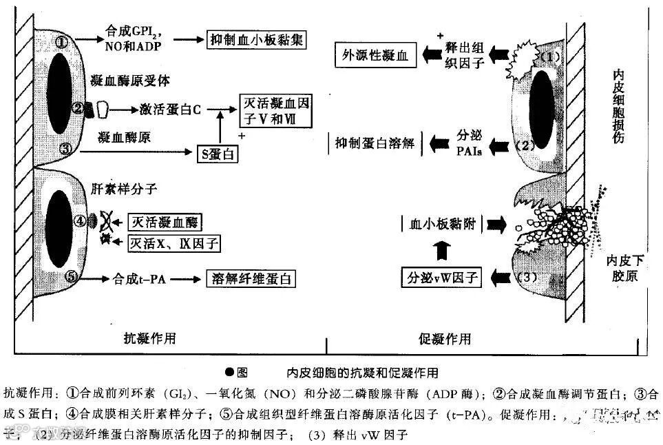 心血管内皮细胞是一层分隔内皮下结缔组织和血液中凝血因子、血小板的单细胞薄膜,具有抗凝、抗血小板粘集的功能。但是当内皮细胞受损时,可合成willebrand因子,使血小板粘附于内皮下的胶原。由于内皮损伤,内皮下结缔组织内的基底膜胶原、原纤维性胶原、弹性蛋白都有强烈的促凝作用,导致血小板粘集形成血栓。