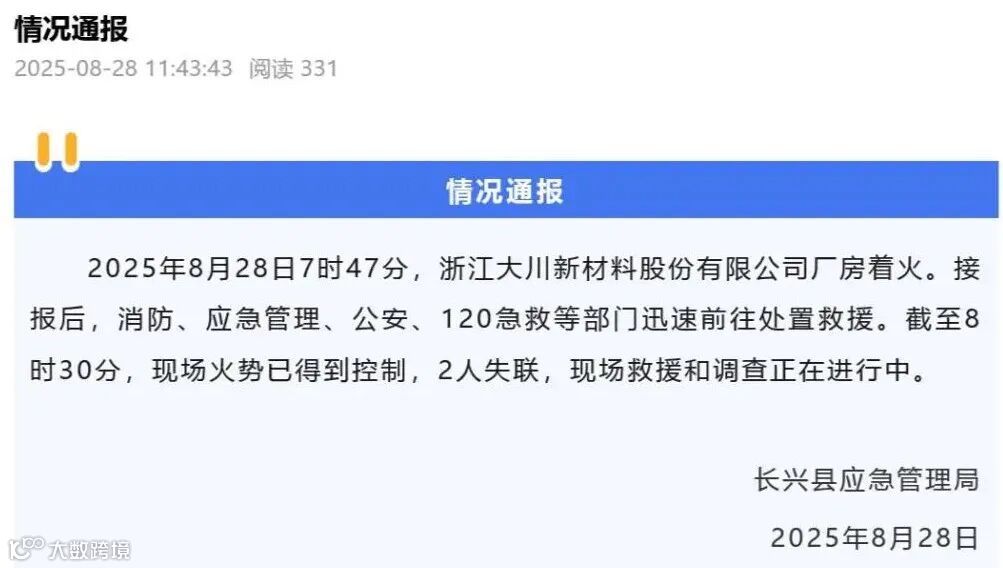 据浙江湖州长兴县应急管理局通报,2025年8月28日7时47分,浙江大川新材料股份有限公司厂房着火。接报后,消防、应急管理、公安、120急救等部门迅速前往处置救援。截至8时30分,现场火势已得到控制,2人失联,现场救援和调查正在进行中。