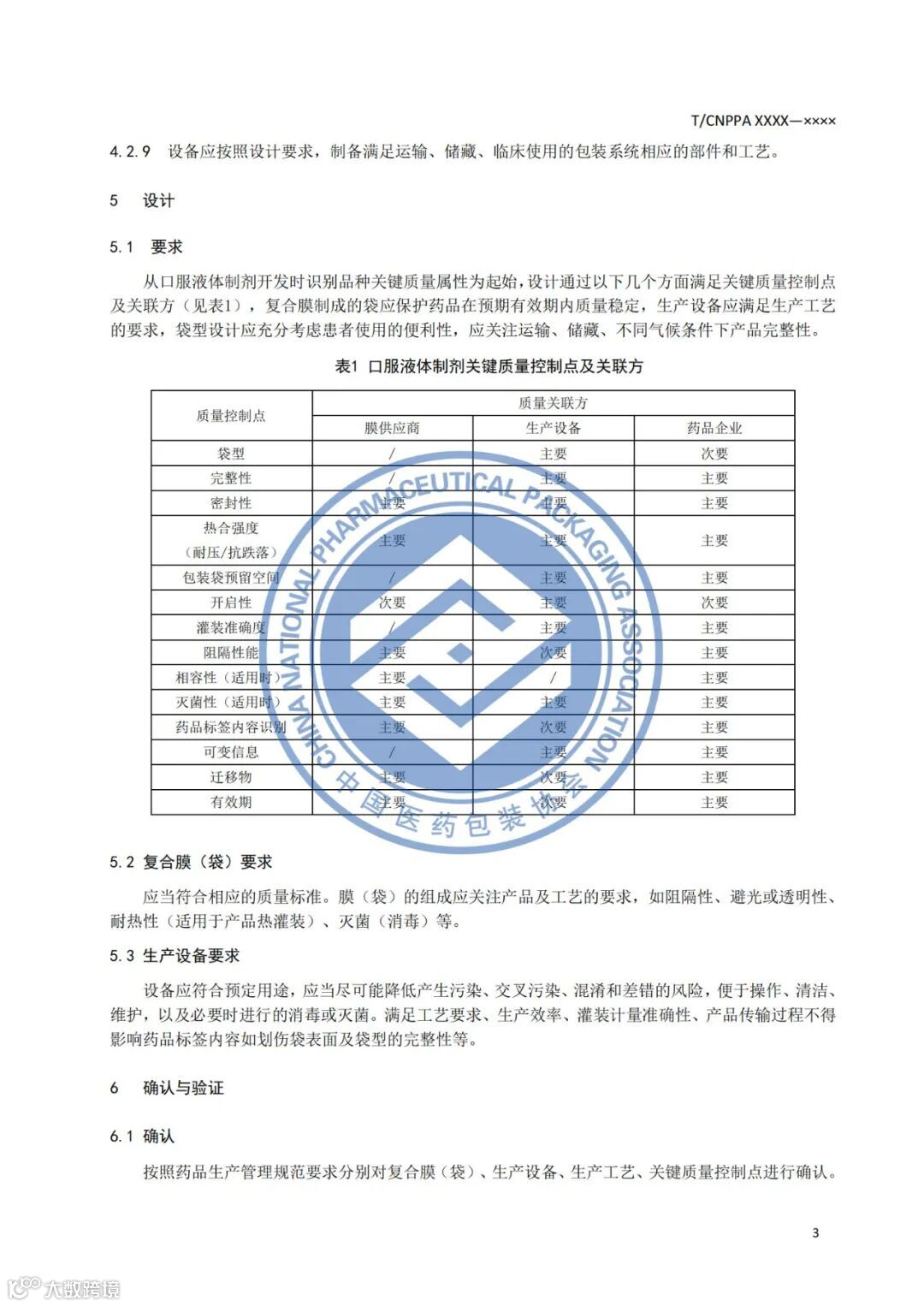 本文件提供了口服液体制剂用复合袋包装的名称术语及材料(复合膜)、生产设备的选择、设计、确认与验证等内容。