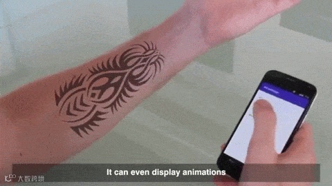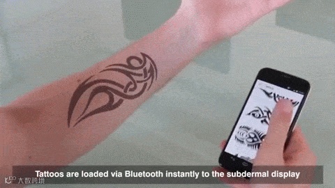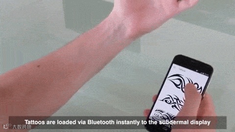 通过将微小的电子墨水颗粒植入表皮下方,这些会变色的颗粒就能透过皮肤显现,从而在手臂上形成一个4 * 6英寸的灰度显示区域。