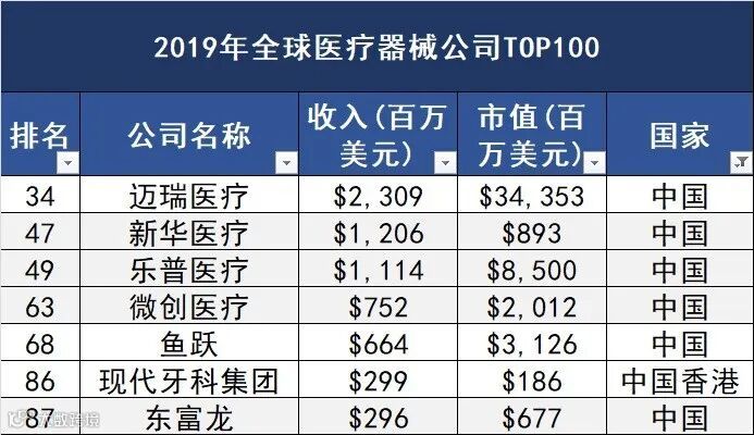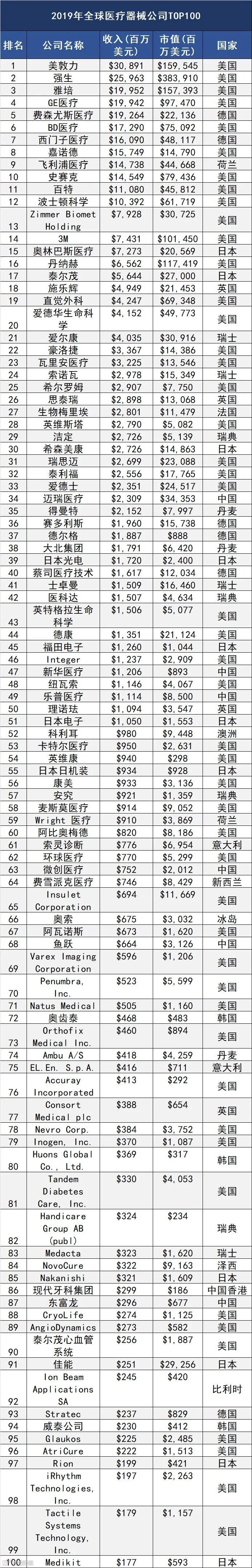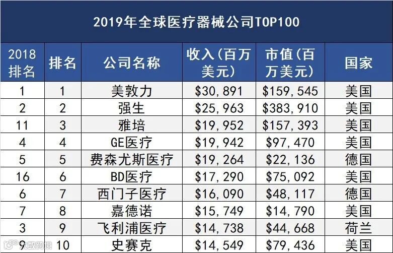 近日,国外权威的第三方网站QMED最新发布了《2019年医疗器械企业百强榜单》,该榜单根据2019年的营收状况对全球医疗器械公司进行了排名。