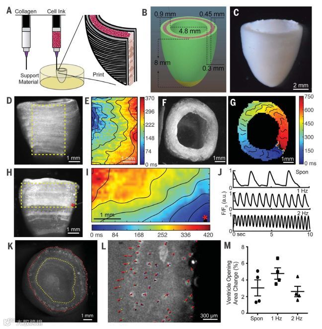 利用此技术他们打印出了由胶原蛋白和人类胚胎干细胞来源的心肌细胞打印出的左心室模型,保证其打印精度大幅提高的同时,兼具人类心室应有的完整结构和自发搏动功能以及对外泵血的功能。他们将胶原打印成左心室内外壁,中间夹层为人胚胎干细胞来源的心肌细胞(HSCS-CMS)和2%的心肌成纤维细胞。打印后培养的第4天夹层细胞就已经开始收缩,而在第7天后他们发现细胞已经分化连接到一起并开始同步收缩。在之后收缩过程中,打印的心室不断向内和向外扩张增厚,而心室壁增厚恰恰是正常心室收缩的一个标志。