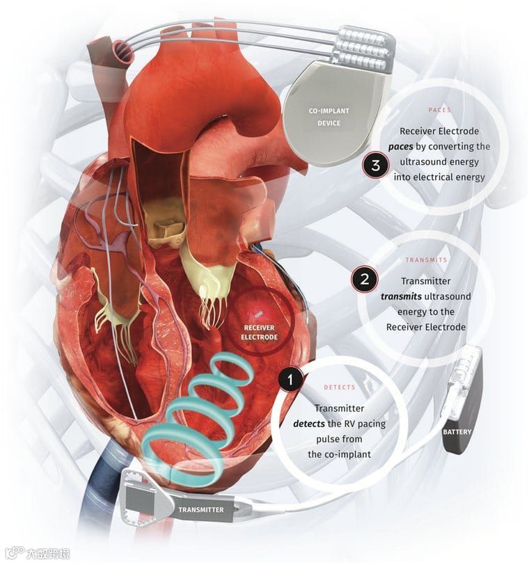 ③ 传统起搏装置。该系统由发生器发动超声波,接收器将其转换为供心脏起搏的电能。WICS™系统可以在检测到右室起搏信号后3ms内进行同步左室起搏,以起到CRT或ICD的作用。