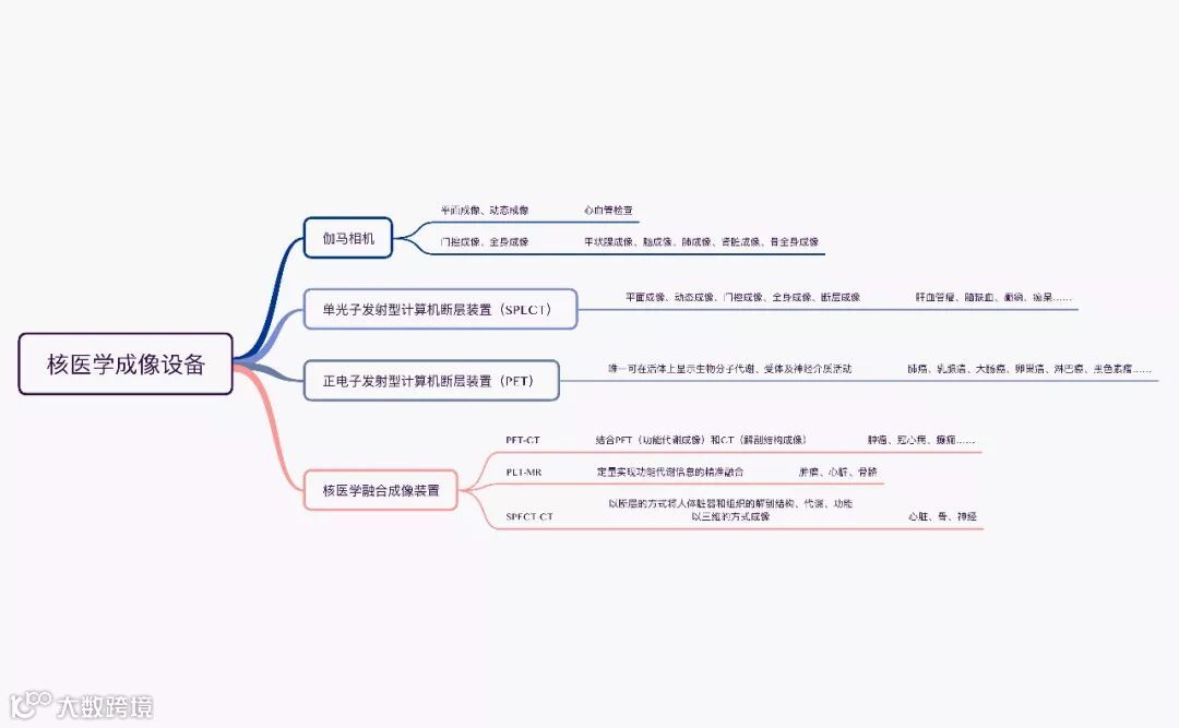 核医学成像设备可以大致分为:伽马相机、单光子发射型计算机断层装置(SPECT)、正电子发射型计算机断层装置(PET)和核医学融合成像装置(如:PET-MRI、PET-CT、SPECT-CT等)