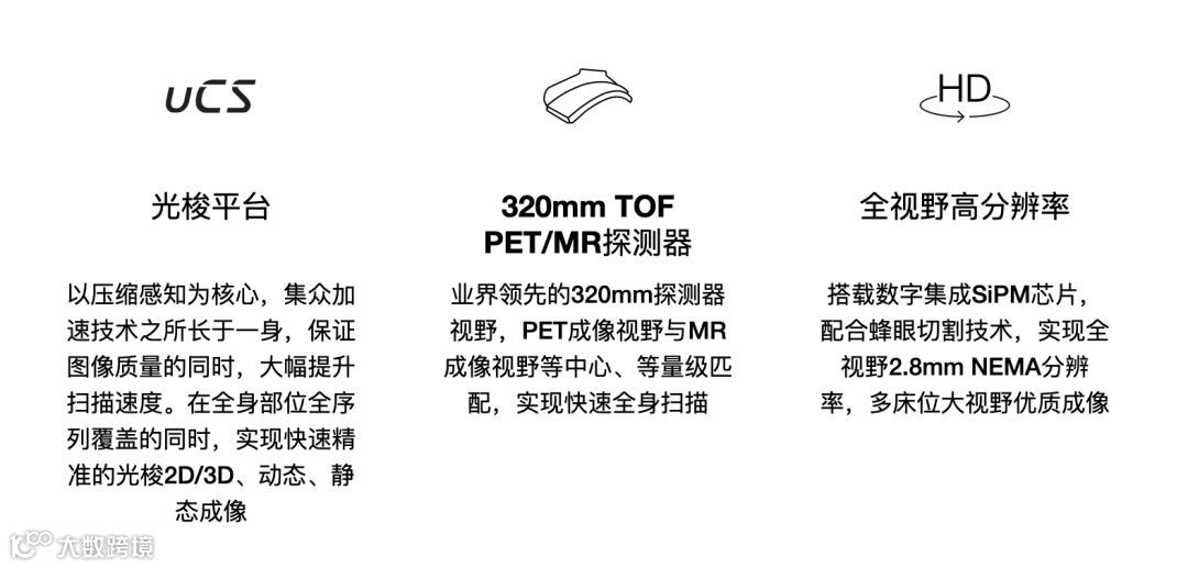 目前联影医疗在核医学领域主推的产品有uExplorer探索者和“时空一体”超清TOF PET-MR 。其中,uExplorer探索者是由联影与美国分子影像科研联盟探索者共同研发的。uExplorer探索者是世界首台全景扫描PET-CT,长达2米,继承了联影PET家族的优秀基因——具备业界最高2.8mm空间分辨率与先进的飞行时间(Time of Flight,TOF)技术。