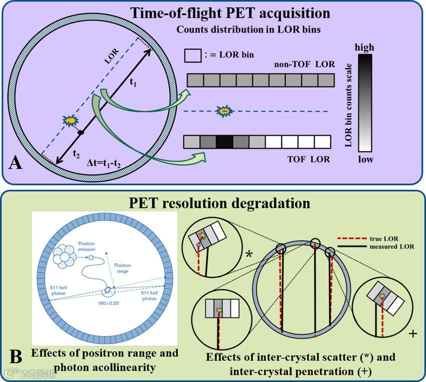 在传统的PET成像中,沿180度响应线识别正电子湮灭。PET扫描仪通过基于180度入射角的点测量角度来计算正电子湮灭的位置。当正电子通过人体时,这种衰减自然发生。最高衰减发生在解剖学的最厚部分。使用大量计算机和软件来分析衰减(或衰减),放射科医师和肿瘤学家能够很好地了解正电子湮灭事件的位置。飞行时间(TOF)技术使测量更进了一步。使用皮秒的测量,TOF不仅测量光子的距离和衰减,而且还在算法中增加了在重合事件期间释放的光子的检测之间的实际时间差,以更准确地识别从湮灭事件到探测器的距离。TOF技术能通过减噪和提高灵敏度,来提升图像质量。