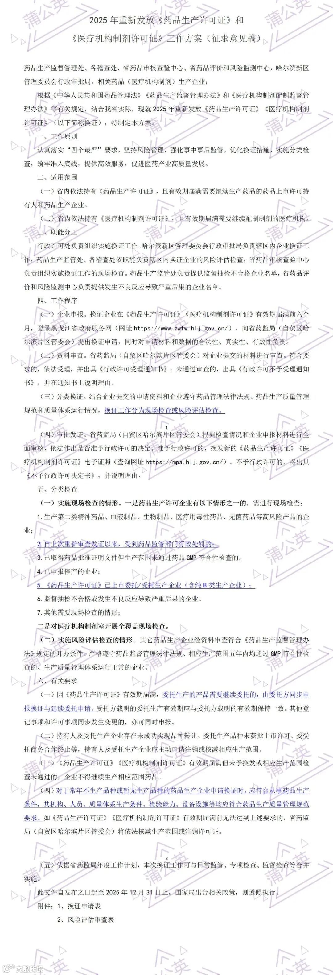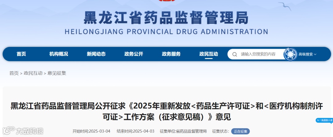 2025年03月04日,黑龙江药监局发布了公开征求《2025年重新发放<药品生产许可证>工作方案(征求意见稿)》意见,征求意见截止04月03日。