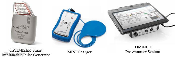 OPTIMIZER智能系统包括植入式脉冲发生器(IPG),充电系统和编程器。IPG能够监测心脏的活动,并向慢性心力衰竭患者的心脏右心室输送非兴奋性电信号(心肌收缩力调节疗法);充电系统用于为IPG和编程器充电,从而保证医务人员能够对控制设备进行设置。