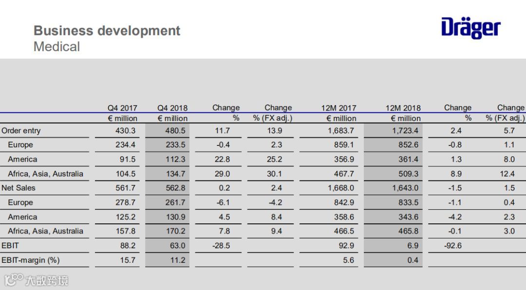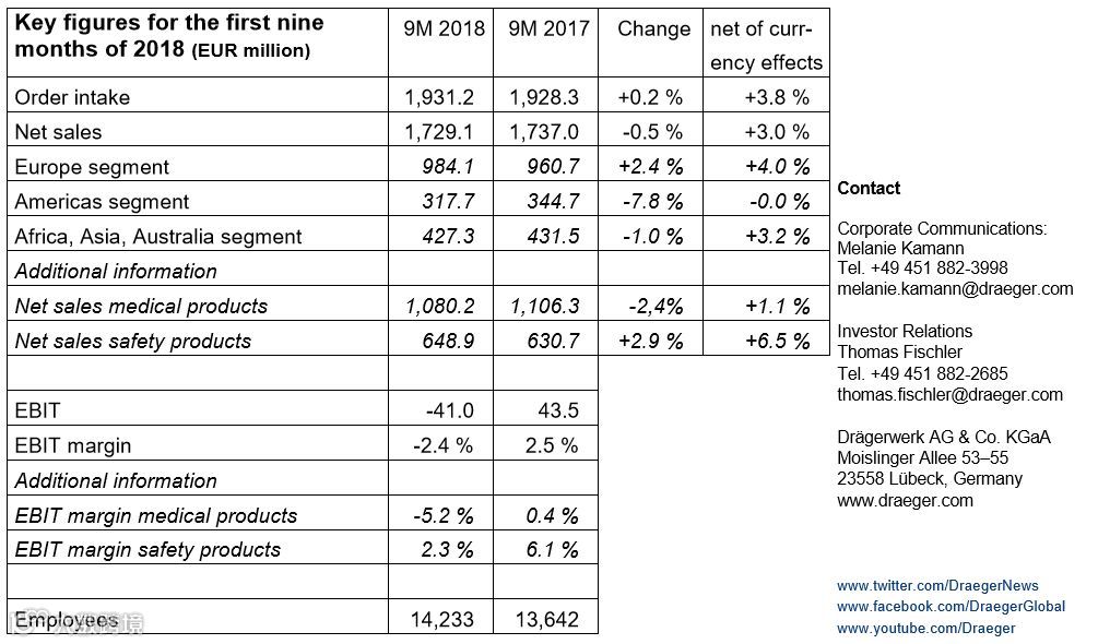 在医疗板块,德尔格的净销售额在2018年的前九个月增长了3.0%,约17.2亿欧元。2018年前九个月的订单量增加了3.8%,订单收入额略高于上年同期的19.3亿欧元。非洲、亚洲和澳大利亚的订单增长最为明显。