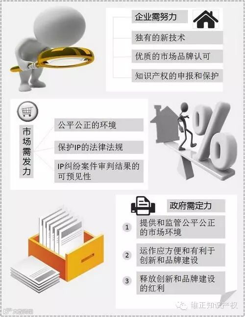 二、市场需发力。企业在经营活动和建设品牌的过程中,需要市场提供一个公平公正的环境,不能允许侵犯知识产权的现象成为常态,而使品牌的无形资产被侵蚀。此外,面对我国虚拟经济中数字环境下的越来越多知识产权的侵权行为,如在互联网上售卖假冒名牌产品和伪劣产品,我国应建立一套严厉的保护知识产权的法律法规,净化和规范网络市场。另外,市场的法律环境应该为品牌创立者提供一个知识产权纠纷案件审判结果的可预见性。可研究和适时建立知识产权高级法院,给全世界、包括中国投资者以信心,并引领重大知识产权案件判决带来的对社会和经济影响的走向。