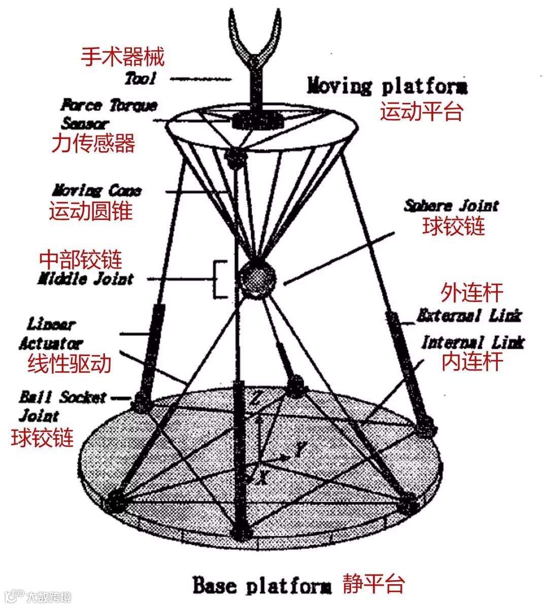 手术机器人采用Stewart并联平台的形式,具备6自由度,工作空间达到20mm* 20mm* 20mm,精度达到0.02mm。采用力和位移的双边控制,从动机器人可跟随主动控制器运动,从动机器人与环境接触力可以通过主动控制器反馈至医生双手。加入扰动观测器(Disturbance observer)消除主动控制器的摩擦力、重力和耦合惯性矩对医生感知手术机器人接触力的影响。
