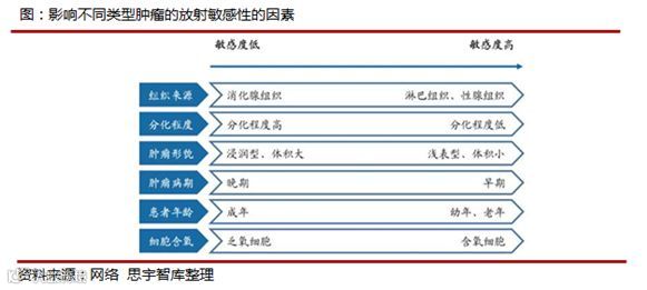 影响不同类型肿瘤的放射敏感性的因素有很多,可以概括为:肿瘤的组织来源、分化程度、肿瘤形貌、所处阶段、细胞含氧量、患者年龄、生活指数等多个方面。