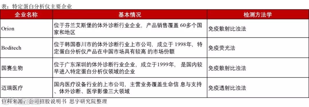 在特定蛋白分析仪及配套试剂领域,主要的企业包括芬兰Orion、韩国Boditech、国赛生物和迈瑞医疗。