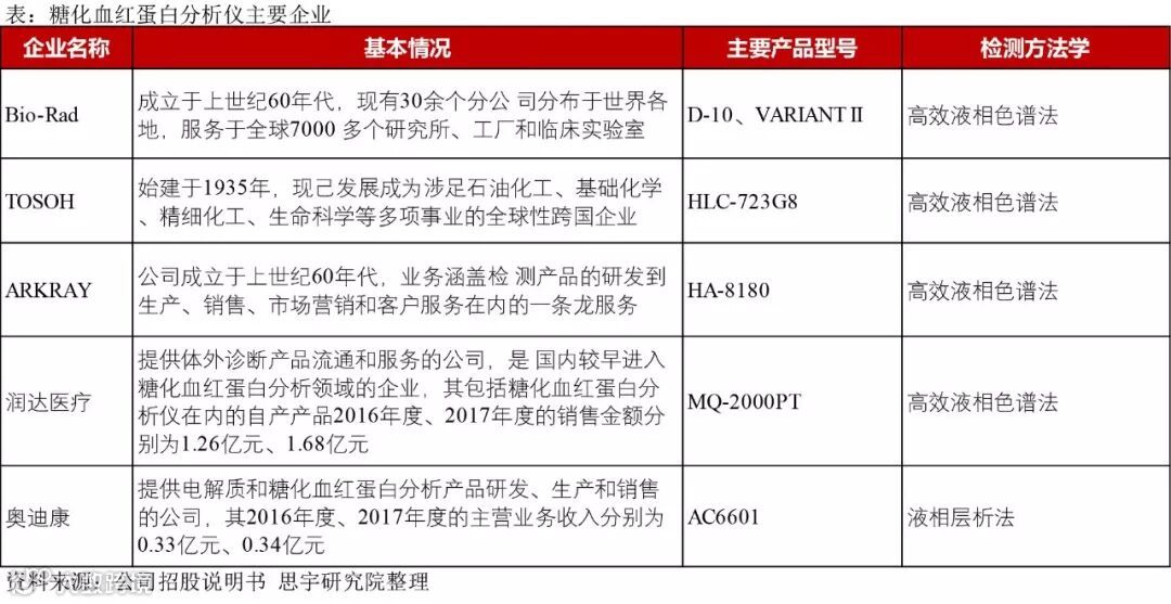 在糖化血红蛋白分析领域,主要的企业包括美国Bio-Rad、日本TOSOH、日本ARKRAY及国内的润达医疗、奥迪康。