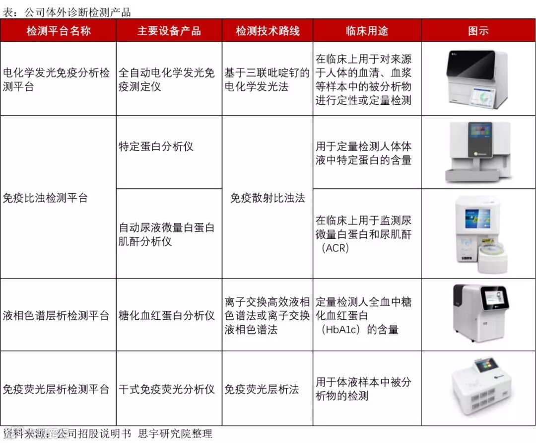 (2)体外诊断产品线:由体外诊断检测设备及配套试剂组成,公司基于电化学发光、免疫比浊、液相色谱、免疫荧光四大检测平台,开发出特色化、专业化的体外诊断设备与配套试剂产品线。其中,电化学发光、免疫比浊、液相色谱检测三大平台的产品应用于医院检验科及临床科室,适用于糖尿病、炎症、风湿、甲状腺功能、激素、肿瘤标记物、内分泌功能和传染性疾病等项目的检测。免疫荧光检测平台产品(POCT类)应用于医院病房、门诊、急诊、监护室、手术室、社区诊所、家庭等,适用于心脏疾病、感染性疾病、肾功能检测、血凝检测等项目的快速临床检测。
