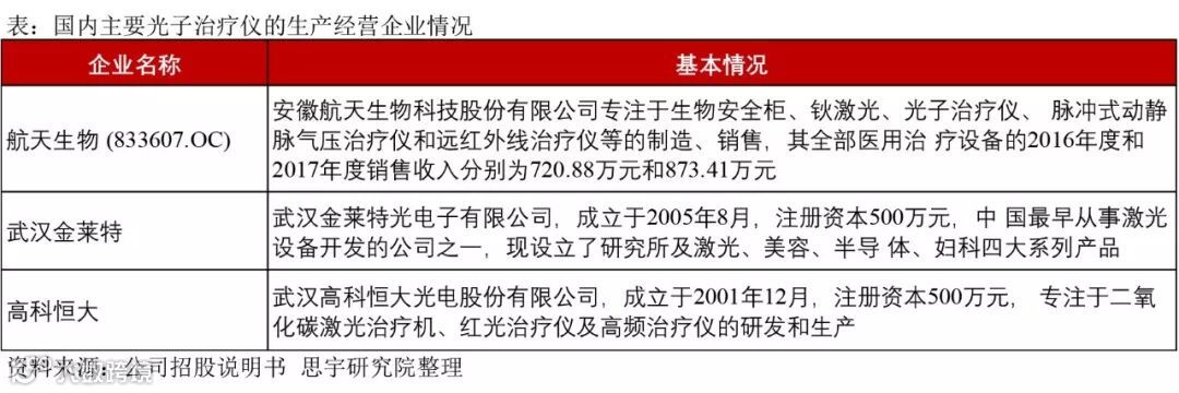 公司的主要产品之一光子治疗仪,目前在国内的主要竞争对手包括航天生物、武汉金莱特、高科恒大。