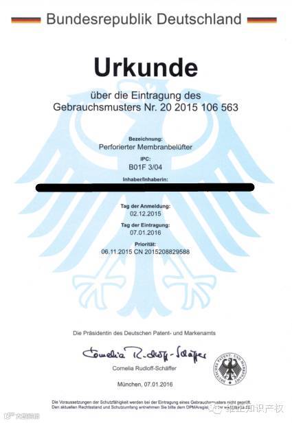 (以上是我司客户德国实用新型的证书,已隐去客户信息)