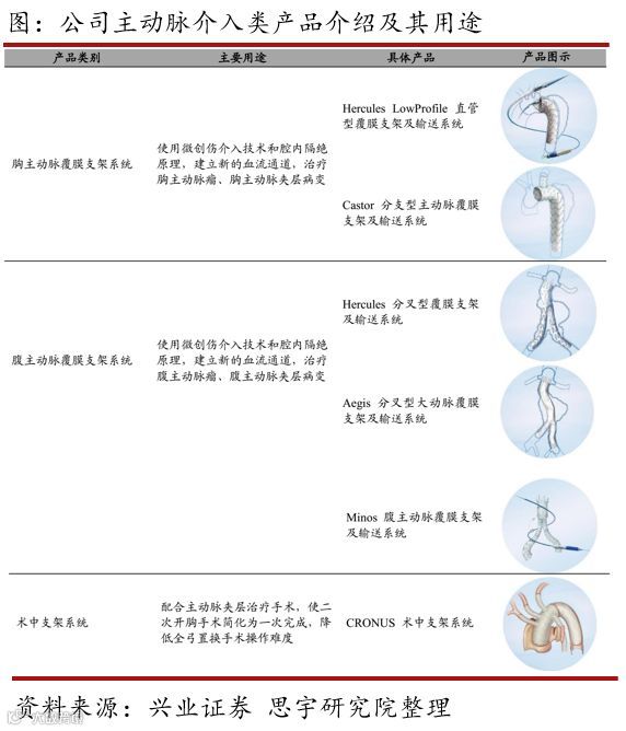 公司胸主动脉覆膜支架系统具体产品包括Hercules LowProfile直管型覆膜支架及输送系统和Castor分支型主动脉覆膜支架及输送系统等;腹主动脉覆膜支架系统具体产品包括 Hercules 分叉型覆膜支架及输送系统、Aegis分叉型大动脉覆膜支架及输送系统和 Minos 腹主动脉覆膜支架及输送系统等,术中支架类产品主要是 CRONUS 术中支架系统。